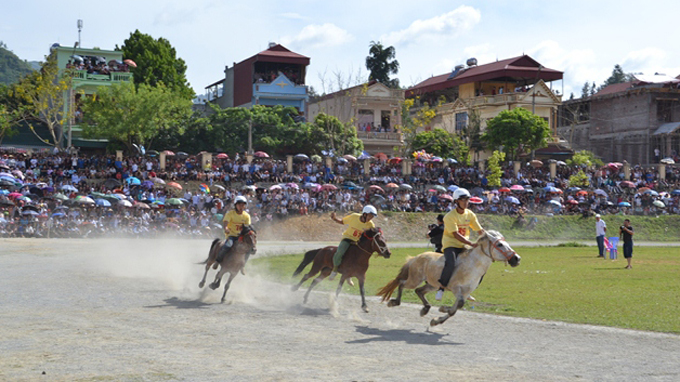 Toàn cảnh đua ngựa Bắc Hà - Ảnh: Hồng Thảo Đường đua dài 1.500 mét, mỗi ngựa đua phải chạy vòng quanh sân vận động 3 vòng để chạm đích. Điều đặc biệt ở đây là mỗi kỵ sĩ là những nông dân chính hiệu, chân đất đi đua ngựa và mỗi “chiến mã” ở đây là những chú ngựa thồ, vốn hằng ngày thồ ngô, lúa, cát, đá… ở thôn bản.