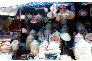 Vẫn chỉ những nguyên liệu là lá, tre, cước cộng thêm một chút khéo léo tỉ mẩn, người Huế đã làm cho chiếc nón vốn chỉ là vật che mưa che nắng trở thành một đề tài bất tận cho thơ ca nhạc, hoạ. Gian hàng nón được đặt một vị trí thật đẹp trong chợ. Những chiếc nón lá được treo bán một cách điệu nghệ kèm với một dãy quai nón từ quai lụa đến quai voan, quai nhung. Có rất nhiều màu song màu chủ đạo vẫn là màu tím: tím hồng, tím xanh, tím trắng, tím than, tím biếc... Có lẽ màu tím muốn nhắc nhở mọi người nhớ về Huế với sắc màu lãng mạn vốn có của nó.
