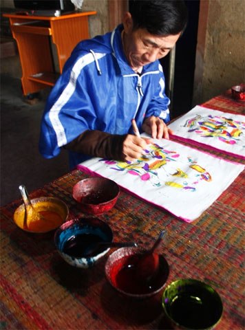 Quá trình tô màu làm theo dây chuyền, mỗi người phụ trách một hai màu, tô xong lại chuyển cho người khác. Lúc này, nghệ nhân thả mình theo cảm hứng và tưởng tượng của bản thân, để những bàn tay tô màu như múa thoăn thoắt trên bản in đen trắng. Có người còn kẹp hai, ba cây bút ở đầu ngón tay để tô cùng một lúc hai, ba mảng màu như nghệ sĩ xiếc biểu diễn bút lông điêu luyện.