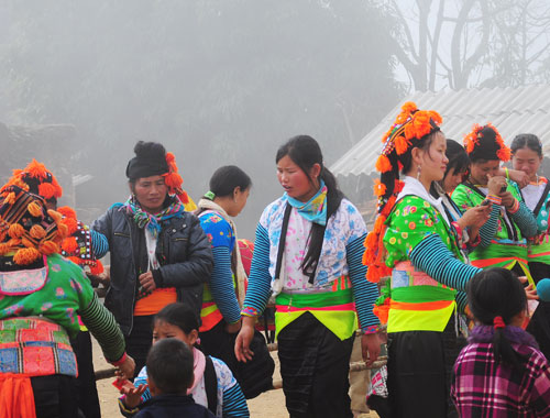 Những cô gái Mông rực rỡ sắc màu tụ tập ở các bãi đất trống xem ném còn.